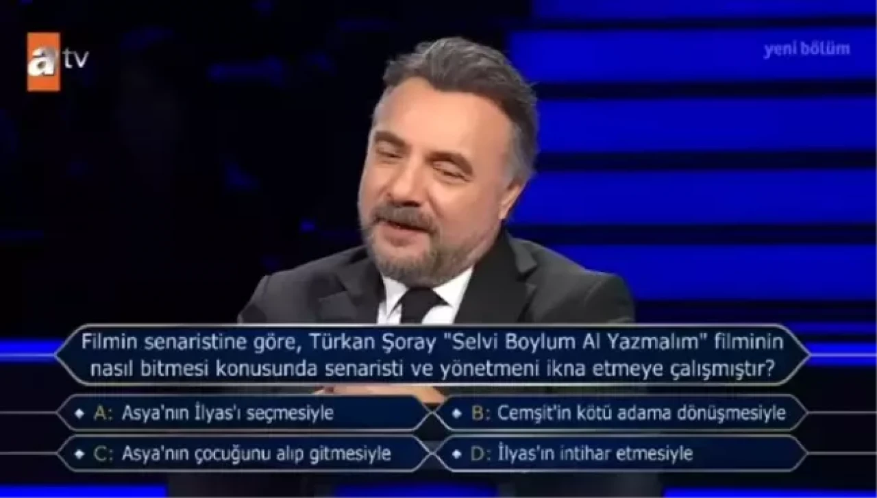 ATV ekranlarının sevilen yarışma programı Kim Milyoner Olmak İster, yeni bölümüyle izleyicileri ekrana kilitlerken, sorular da bir hayli dikkat çekiyor. Son bölümdeki Selvi Boylum Al Yazmalım sorusu, Türkan Şoray'ın filmin sonuyla ilgili senarist ve yönetmenle yaptığı tartışmayı gündeme getirdi. Peki, bu sorunun cevabı nedir?
