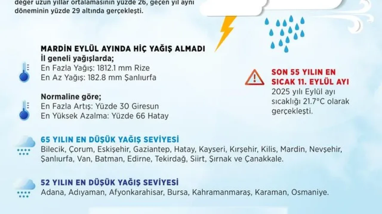 2025 Eylül ayı değerlendirmelerine göre Türkiye genelinde ortalama 21,4 milimetre yağış ölçüldü. Bu değer, uzun yıllar ortalamasının yüzde 14, geçen yıl eylül ayının ise yüzde 37 altında gerçekleşti. Mardin, eylül ayında hiç yağış almayan tek il oldu. Edirne, Kırklareli ve Tekirdağ da son 21 yılın en düşük eylül yağışlarını gördü.