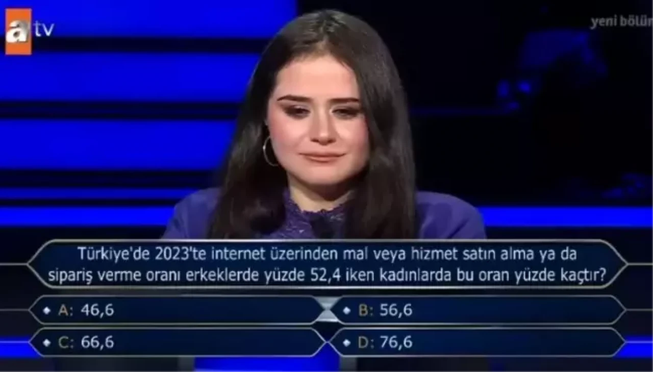 Kim Milyoner Olmak İster'de dikkat çeken sorulardan biri, Türkiye’de internet alışverişine yönelik kadın ve erkeklerin oranlarını sorguladı. Erkeklerde yüzde 52,4 olan bu oran kadınlarda ne kadar? İşte detaylar…