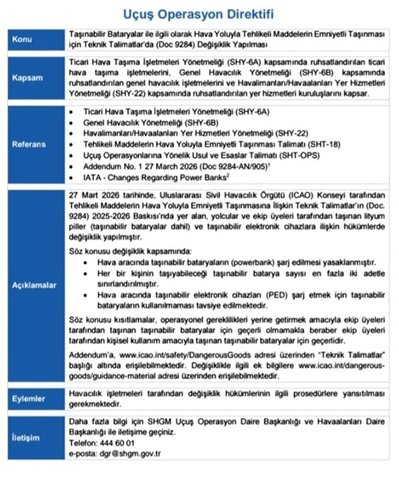 Hava yolu seyahatlerinde güvenlik protokolleri güncellenmeye devam ediyor. Sivil Havacılık Genel Müdürlüğü (SHGM), Uluslararası Sivil Havacılık Örgütü’nün (ICAO) teknik talimatlarını temel alarak, lityum piller ve taşınabilir elektronik cihazların kullanımı konusunda yeni bir Uçuş Operasyon Direktifi yayımladı.