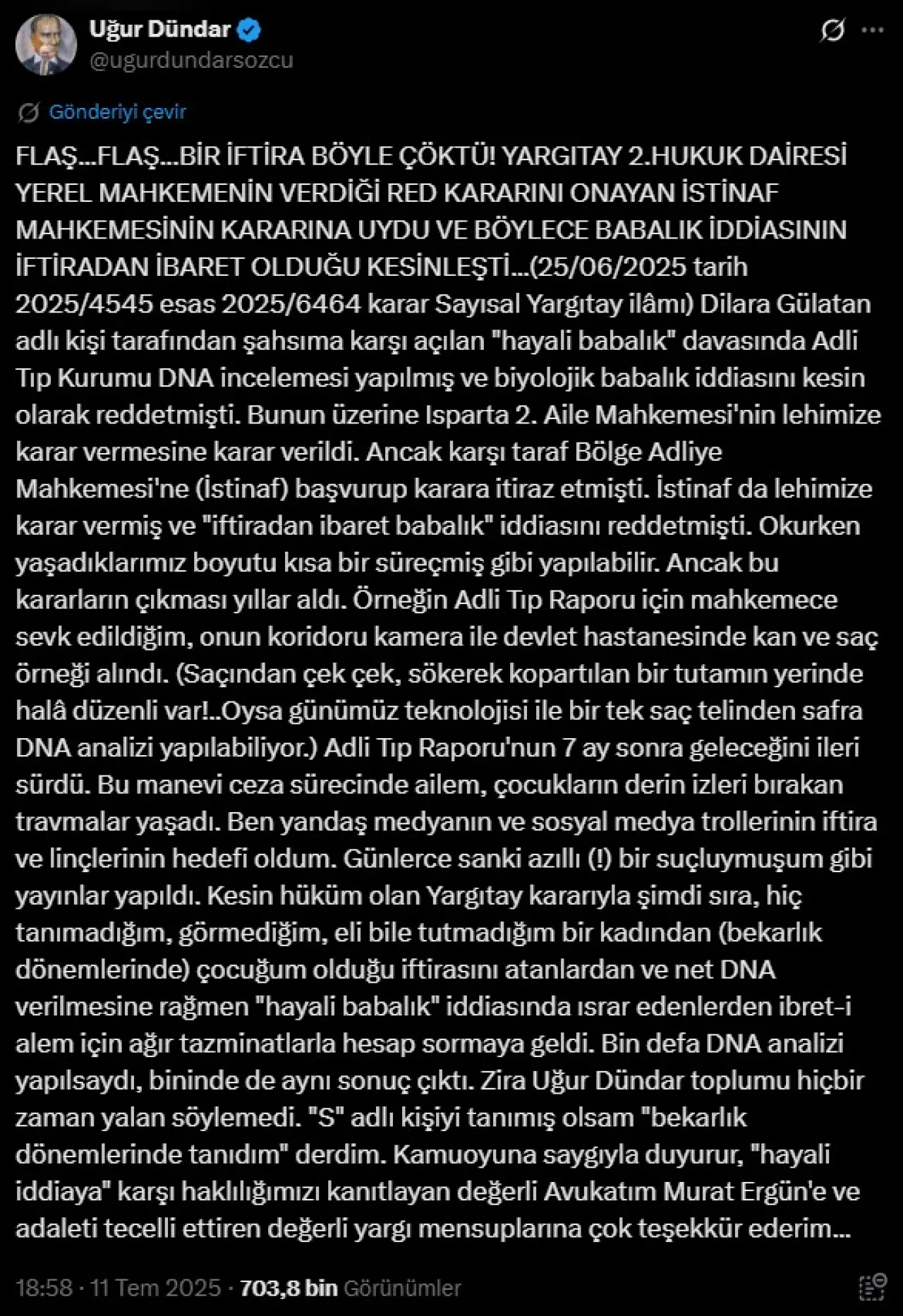 Ünlü gazeteci Uğur Dündar, kendisine yöneltilen babalık iddiasıyla ilgili açılan davada nihai kararın verildiğini duyurdu. Yargıtay, Adli Tıp Kurumu'nun bilimsel raporlarını esas alarak, Dündar ile davacı Dilara G. arasında herhangi bir biyolojik bağın bulunmadığını kesin hükme bağladı.