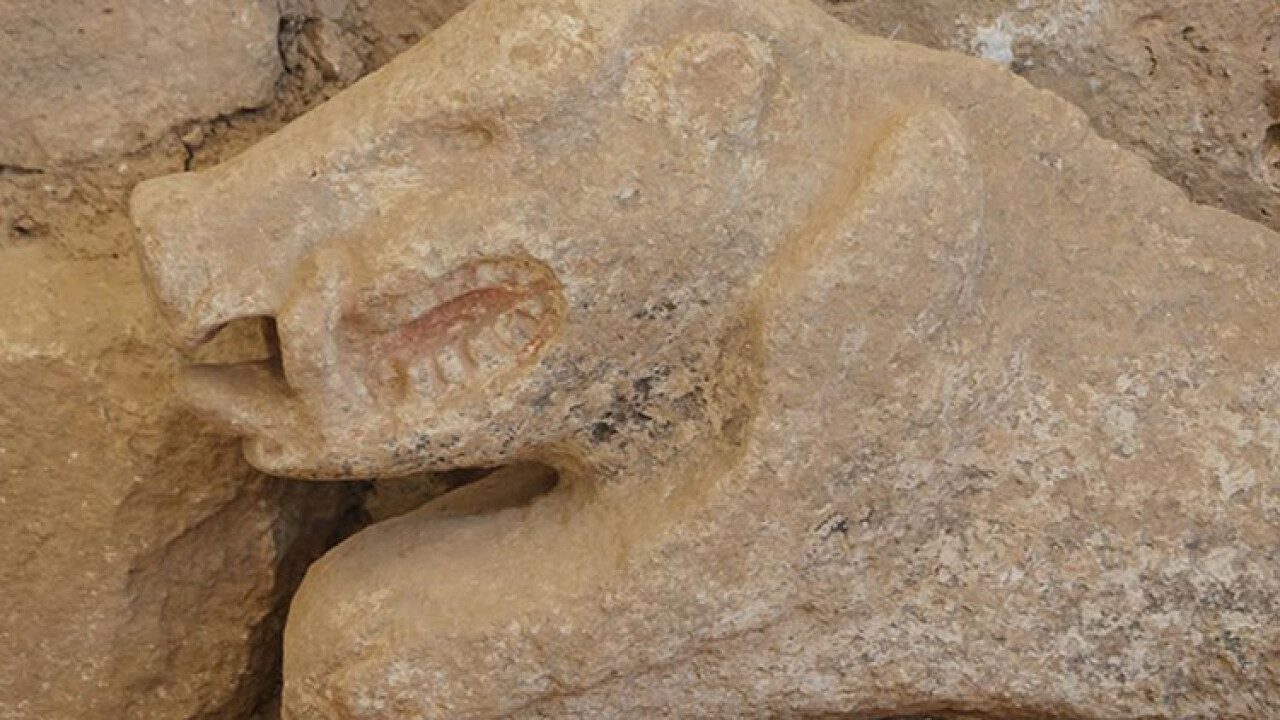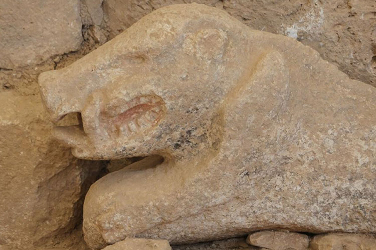Göbeklitepe'nin "D yapısında" bulunan, kireç taşından yapılmış, gerçek boyutlu yaban domuzu heykelinin yüzeyinde kırmızı, beyaz ve siyah pigment kalıntılar görülüyor.