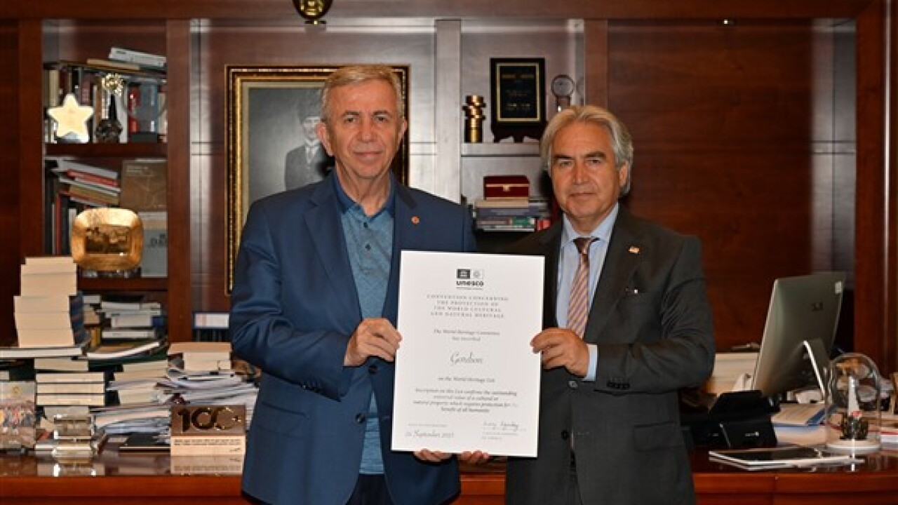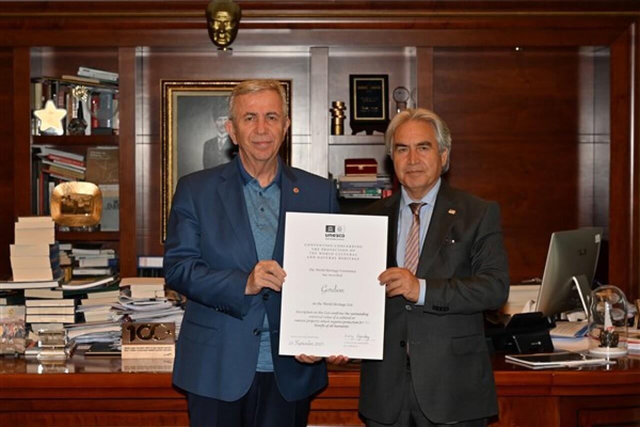 Ankara’nın Polatlı ilçesinde bulunan Gordion Antik Kenti ve Altındağ ilçesi Ulus bölgesinde bulunan Aslanhane Cami’nin UNESCO Dünya Mirası Kalıcı Listesi’ne kabulüne ilişkin hazırlanan sertifikalar, Ankara Büyükşehir Belediye Başkanı Mansur Yavaş’a sunuldu.