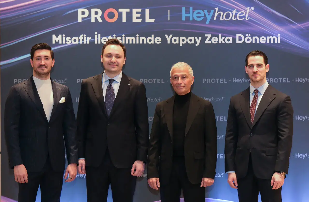 Fotoğraf altı (soldan sağa): Heyhotel AI Kurucu Ortağı Ekin Şen, Heyhotel AI Kurucu Ortağı ve CEO'su Ahmet Göker, Protel Holding Yönetim Kurulu Başkanı Metin Arghan, Heyhotel AI Kurucu Ortağı ve COO'su Z. Emre Çüngüşlügil.