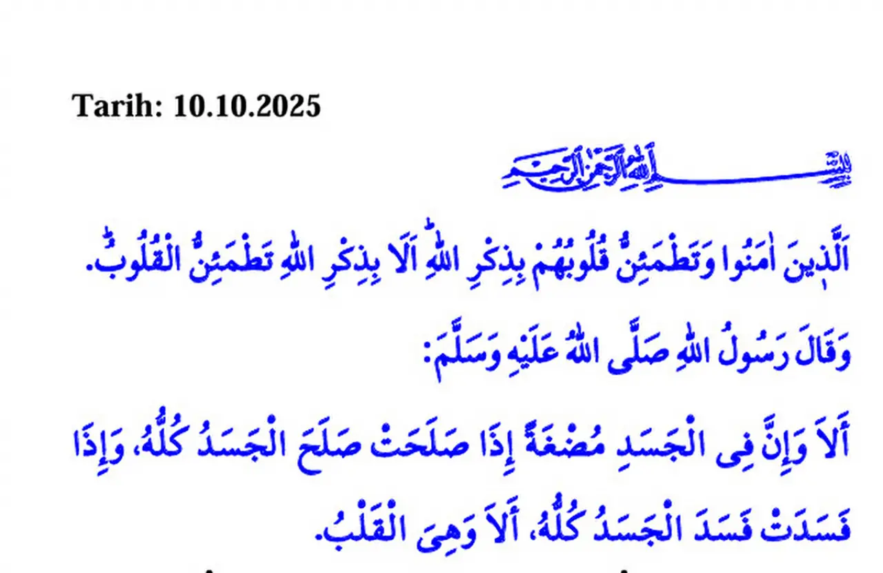 Diyanet İşleri Başkanlığı, 10 Ekim 2025 tarihli Cuma hutbesinin konusunu “Cenâb-ı Hakk’ın Nazargâhı: Kalp” olarak belirledi. Bu haftaki hutbede, kalbin insanın manevi dünyasındaki önemi, iman ve takvanın merkezi oluşu vurgulandı. Hutbede, “Kalpler ancak Allah’ı zikretmekle huzur bulur” ayetine yer verilerek, kalbin temizlenmesi ve ilahi sevgiyle dolması gerektiği hatırlatıldı.