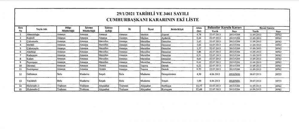 Cumhurbaşkanı Recep Tayyip Erdoğan tarafından imzalanan ve Resmi Gazete’de yayımlanan karara göre, Trabzon’un Akçabat İlçesinde bulunan Hıdırnebi-1, Hıdırnebi-2, Bolu’nun Göllü Ören, Yaylabeli ile Amasyna’nın Ahmetoğlu, Keşbeli, Çukurtuzla, Melikli, Çukuryayla, Alanbaşı, Kadı Çayırı, Kulam, Peynirçayı, Düvenci, Fındıkpınar yaylarının statüleri kaldırıldı.