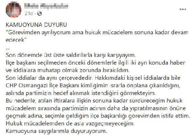 Açıklamalarına devam eden M.A., "Hakkımdaki kişisel iddialarda bile CHP Osmangazi İlçe Başkanı kimliğimin ısrarla ön plana çıkarıldığını, aslında partimizin hedef alınmak istendiğini görmekteyim. Bu nedenle, atılan iftiralara ilişkin sonuna kadar sürdüreceğim hukuk mücadelem sırasında partimizin adının daha da yıpratılmasının önüne geçmek adına, seçimle geldiğim ilçe başkanlığı görevimden istifa ettim. Hukuk mücadelemden de asla vazgeçmeyeceğim. Kamuoyuna saygılarımla duyuruyorum" dedi.