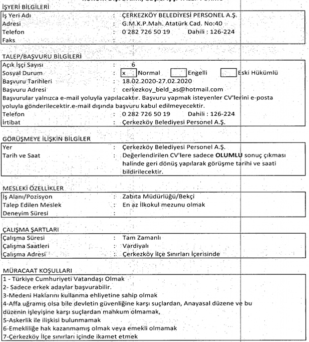 tarafından yayımlanan ilanda , zabıta müdürlüğü bünyesine bekçi alımı yapılacağına yer verildi. En az ilkokul mezunu adaylar arasından yapılan bekçi alımında başvurular bugün başladı ve 27 Şubat 2020 gününe kadar alınacak. Çerkezköy Belediyesi tarafından yayımlanan duyurunun ilan metni şu şekilde: