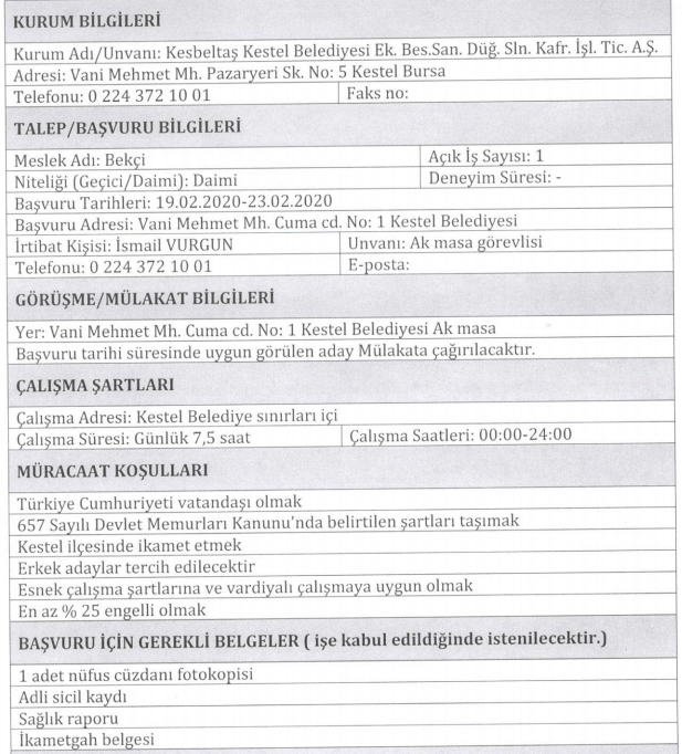 Bursa Kestel Belediyesi tarafından yayımlanan duyuruda bekçi alımı yapılacağına yer verildi. 23 Şubat 2020 tarihine kadar yapılacak başvurunun detaylar şu şekilde: