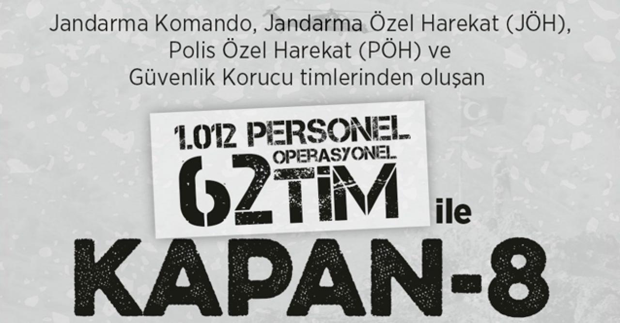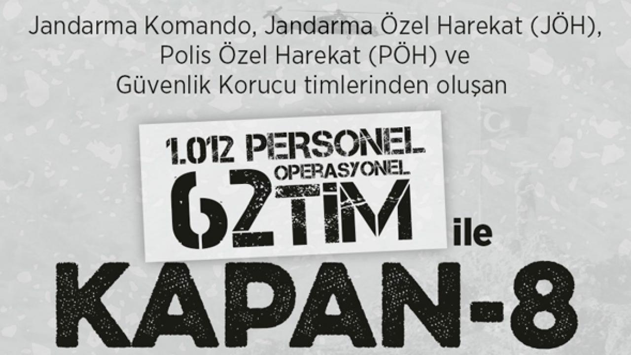 Bakanlıktan yapılan açıklamada, Ağrı, Kars ve Iğdır'daki Ağrı Dağı, Çemçe ve Madur Barınma alanında bulunduğu değerlendirilen teröristleri etkisiz hale getirmek amacıyla operasyon başlatıldığı bildirildi. Erzurum Jandarma Bölge Komutanı, Ağrı İl Jandarma Komutanı, Kars İl Jandarma Komutanı ve Iğdır İl Jandarma Komutanının bizzat operasyonu arazide sevk ve idare ettiği belirtilerek, "Operasyonda Jandarma Komando, Jandarma Özel Harekat, PÖH ve Güvenlik Korucu timlerinden oluşan bin 12 personel (62) operasyonel tim görev almaktadır. Yurt içinde terörün tamamen ortadan kaldırılmasına yönelik yürütülen Kapan operasyonları, halkımızın yoğun desteğinde kararlı bir şekilde başarı ile devam etmektedir" denildi.