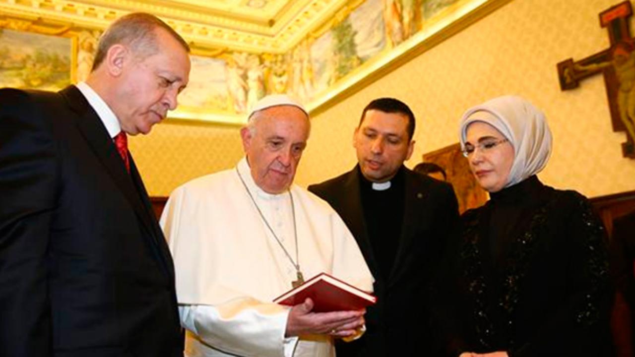 Erdoğan, Papa'ya eski İstanbul'u 24 parçada tasvir eden minyatür İznik çinisi ile Mesnevi'nin İtalyanca ve İngilizce baskılarını hediye etti. Papa da Cumhurbaşkanı Erdoğan'a barışı simgeleyen madalyon takdiminde bulundu. Erdoğan ve Papa, sunulan hediyeler hakkında birbirlerine bilgi verdi.