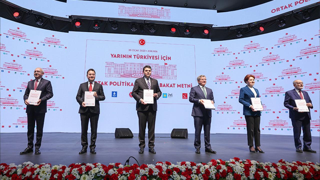 Millet İttifakı’nın Ortak Politikalar Mutabakat Metni altı siyasi parti genel başkanının katıldığı toplantıda açıklandı. Ortak Politikalar Mutabakat Metni'nin açıklandığı toplantı saat 11.45'te ATO Congresium Kongre ve Sergi Merkezi’nde başladı. “Hukuk, Adalet ve Yargı” başlığı altında açıklanan Ortak Mutabakat metni 9 ana başlık altında 2 binin üzerinde yeni düzenlemeyi içeriyor. 3 bin 107 kişilik salonunun tamamı doldu. CHP Genel Başkanı Kemal Kılıçdaroğlu, İyi Parti Genel Başkanı Meral Akşener, Saadet Partisi Genel Başkanı Temel Karamollaoğlu, DEVA Partisi Genel Başkanı Ali Babacan, Gelecek Partisi Genel Başkanı Ahmet Davutoğlu ve Demokrat Parti Genel Başkanı Gültekin Uysal salona geldi.