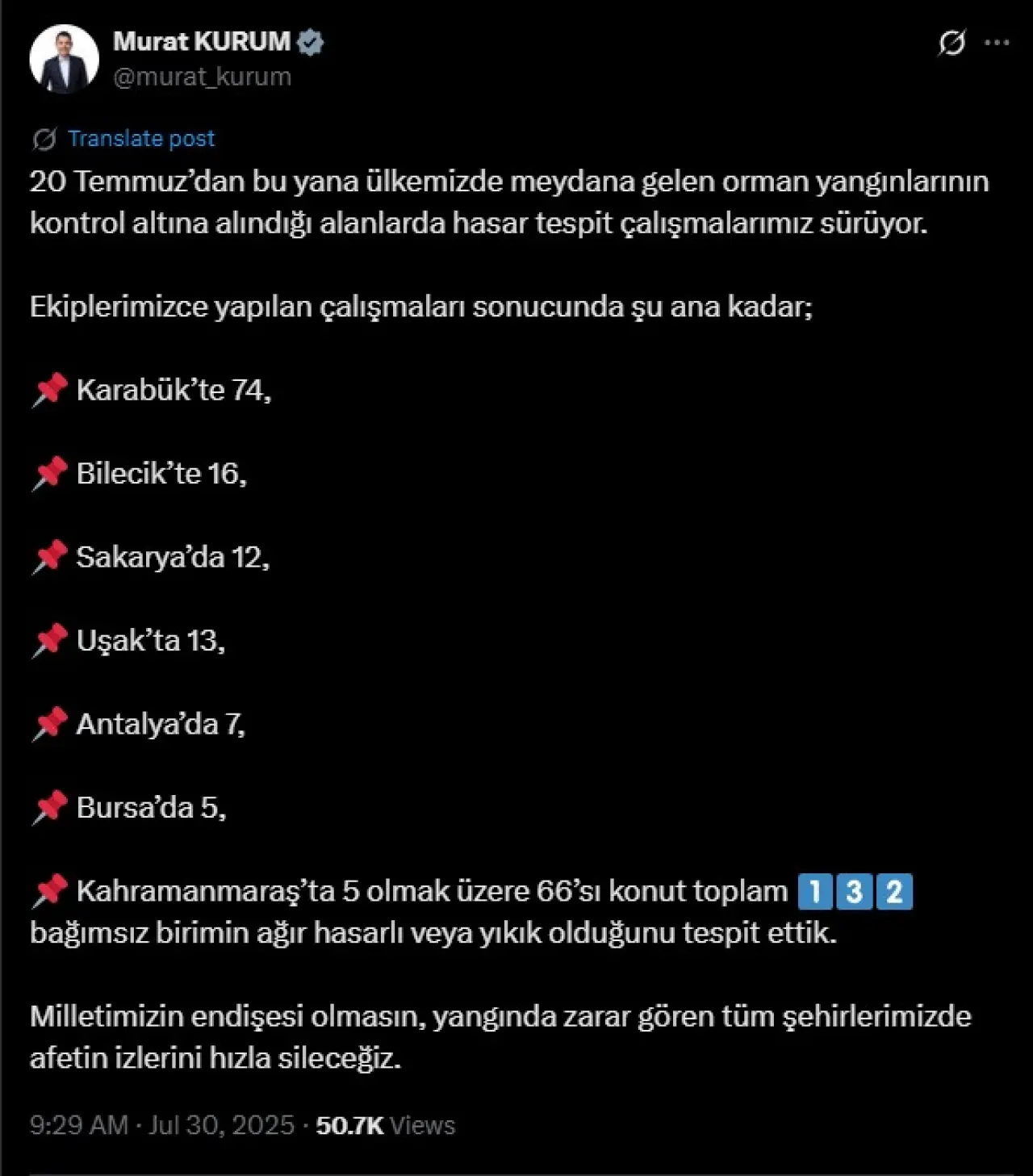 “20 Temmuz’dan bu yana meydana gelen orman yangınlarının kontrol altına alındığı alanlarda ekiplerimiz sahada. Şu ana kadar 132 bağımsız birimin yıkık veya ağır hasarlı olduğu belirlendi. Milletimizin endişesi olmasın. Yangında zarar gören tüm şehirlerimizde afetin izlerini hızla sileceğiz.”