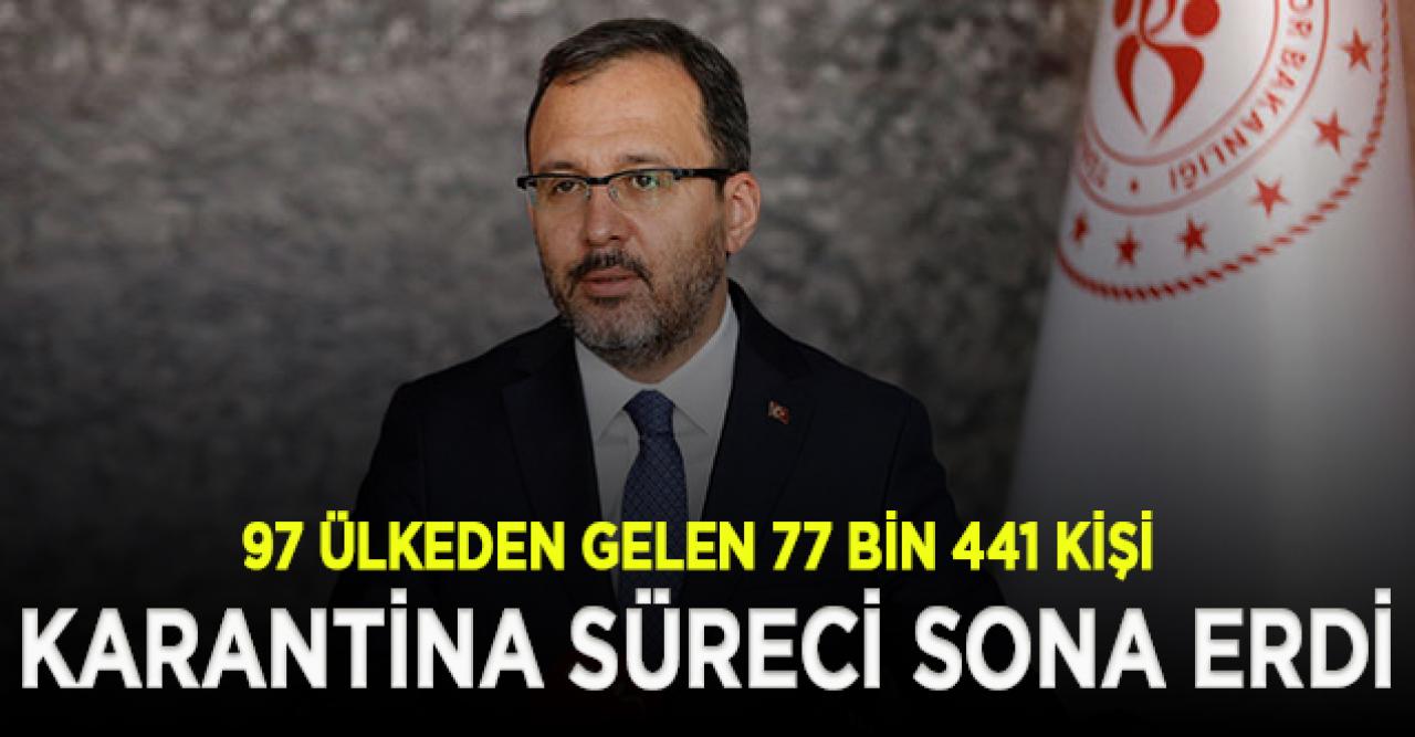 Bakan Kasapoğlu, karantina süreci için, Türkiye genelinde sahip olduğumuz kapasitenin yalnızca yüzde 13’ünü kullandıklarını belirterek, “Yurtlarımızda sağlanan destek hizmetlerini, faaliyetlerimizi, uygularımızı kapsayan memnuniyet araştırmasında yüzde 85,94’lük bir memnuniyet oranı yakaladık. Yurt altyapımızın ne kadar devasa olduğunu, yapılan yatırımlarla gelinen noktanın ne denli kapsayıcı olduğunu bir kez daha belirtmek istiyorum. Bugüne kadar 76 ilimizdeki 177 yurdumuzda, dünyanın 97 farklı ülkesinden gelen toplamda 77 bin 441 vatandaşımıza ev sahipliği yaptık. Bu rakamın içerisinde 1183 askerimiz de bulunuyor. Öte yandan yurtlarımız, yoğun mesailerde, üstün bir fedakârlık örneği göstererek emek veren, bu süreçte evlerine gitmeyi tercih etmeyen sağlık çalışanlarımız için de tahsis edildi. 56 ilimizde bulunan 113 öğrenci yurdumuzda 6 bin 305 sağlık çalışanımızı misafir ettik. Yine 3 bin Adalet Bakanlığı personelimizi de yurtlarımızda ağırladık. 20 ilimizde 6 bin 956 oda kapasiteli 29 yurdumuzu ise ihtiyaç halinde Sosyal İzolasyon ve Gözlem Merkezi olarak kullanılmak üzere Sağlık Bakanlığı’na tahsis ettik. Buralarda da toplamda 1232 vatandaşımızı misafir ettik” ifadelerini kullandı.