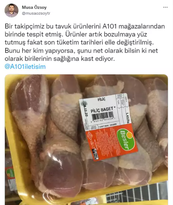 Sosyal medyada paylaşım yapan Musa Özsoy, "Bir takipçimiz bu tavuk ürünlerini A101 mağazalarından birinde tespit etmiş. Ürünler artık bozulmaya yüz tutmuş fakat son tüketim tarihleri elle değiştirilmiş. Bunu her kim yapıyorsa, şunu net olarak bilsin ki net olarak birilerinin sağlığına kast ediyor." dedi.