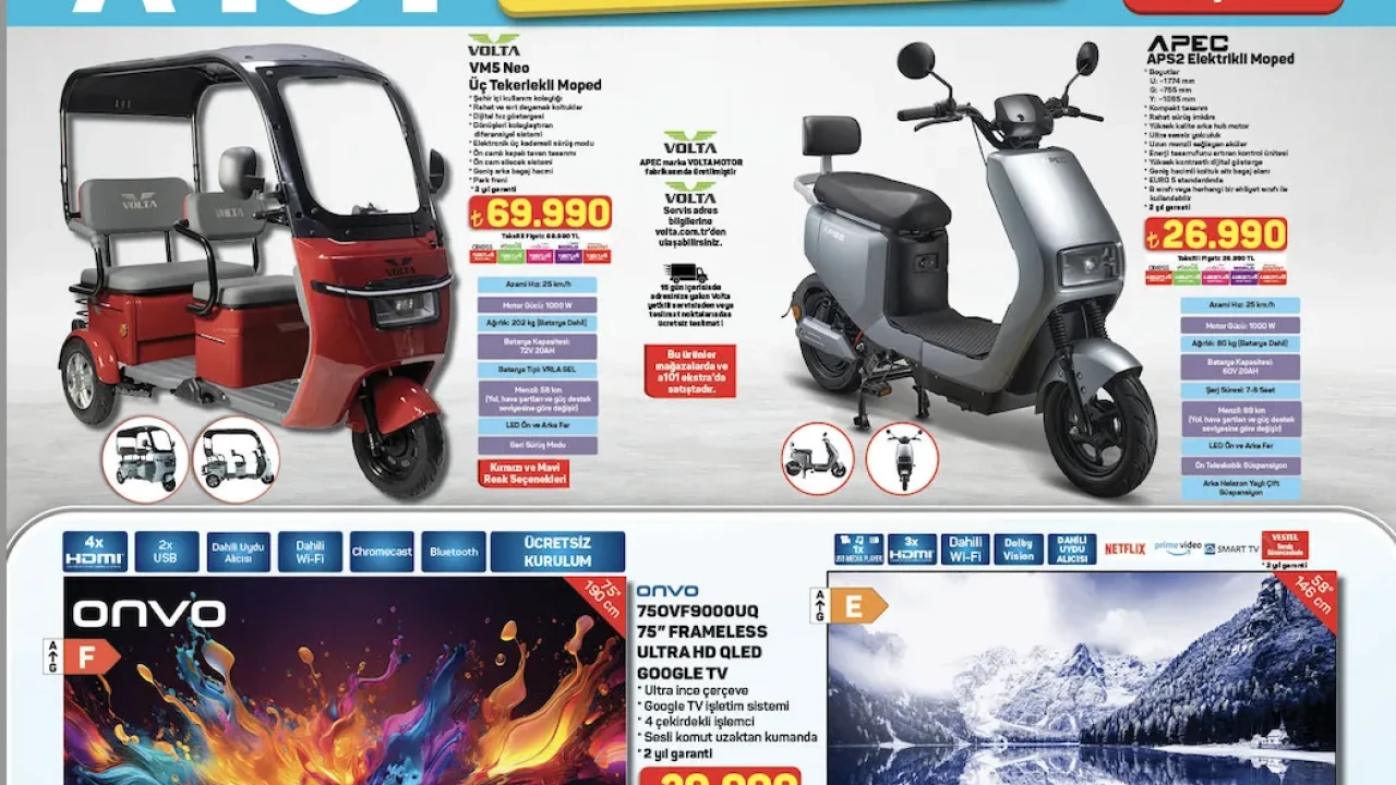 Modern ulaşım çözümleri arasında öne çıkan VOLTA VM5 Neo Üç Tekerlekli Moped, yalnızca 69.990 TL fiyatıyla A101 raflarında yerini alıyor. Aynı şekilde şehir içi ulaşımda çevreci ve pratik çözüm arayanlar için APEC APS2 Elektrikli Moped, 26.990 TL gibi dikkat çekici fiyatıyla satışta olacak.