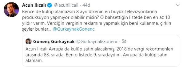 Acun Ilıcalı'nın 'takım satın alabilirim' açıklamasının ardından 2018 yılı vergi rekortmenleri listesine 9. sıradan giriş yapan avukat Gönenç Gürkaynak, "Acun Ilıcalı Avrupa'da kulüp satın alacakmış. 2018'de vergi rekortmenleri arasında 83. sırada. Ben o listede 9. sıradaydım. Avrupa'da kulüp satın alamam." paylaşımında bulundu.