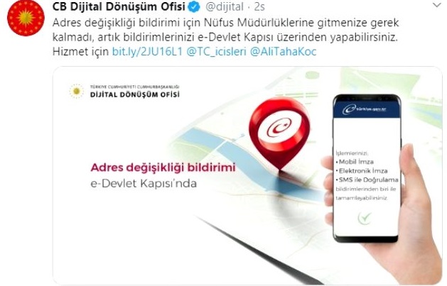 Dijital Dönüşüm Ofisi'nin Twitter hesabından yapılan açıklama,"Adres değişikliği bildirimi için Nüfus Müdürlüklerine gitmenize gerek kalmadı, artık bildirimlerinizi e-Devlet Kapısı üzerinden yapabilirsiniz" denildi.