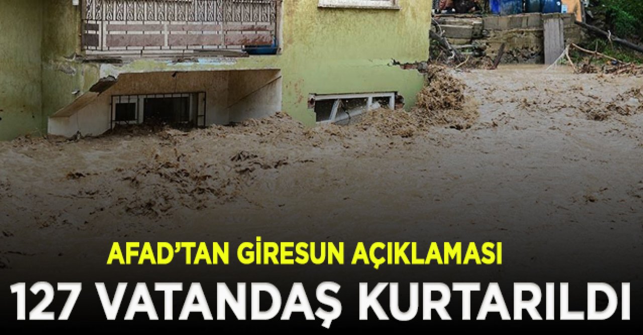 AFAD'ın sosyal paylaşım sitesi Twitter'daki hesabından yapılan açıklamada, "Giresun’da aşırı yağışlardan dolayı Dereli, Espiye, Doğankent, Tirebolu, Güce, Görele ve Yağlıdere ilçelerinde sel, heyelan ve su baskınları meydana gelmiştir. AFAD, Jandarma, Belediye, İtfaiye, Karayolları, UMKE, Türk Kızılay ve AKUT ekiplerimizle bölgede 423 personel ve 153 araç ile aralıksız devam eden arama kurtarma çalışmalarında şu ana kadar 127 vatandaşımız kurtarılmıştır. Gelişmeler takip edilmektedir" denildi.