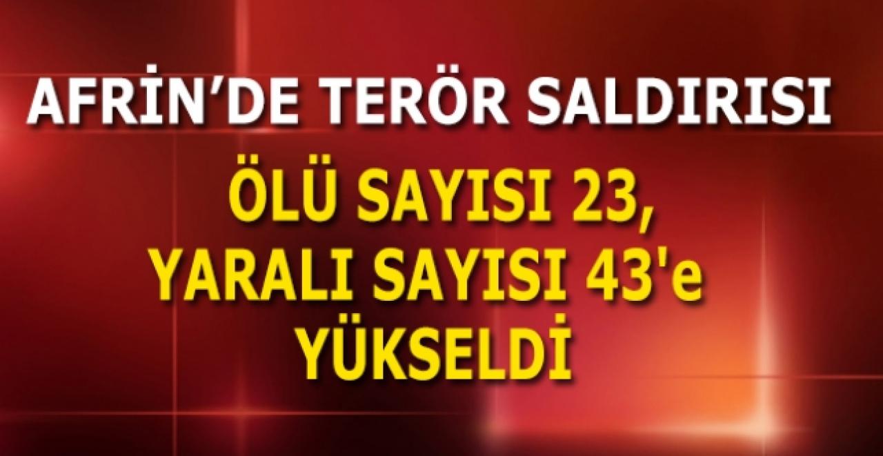 Suriye'nin Afrin ilçesinde bomba yüklü tankerin infilak etmesi sonucu ölü sayısının 23'e, yaralı sayısının 43'e yükseldiği açıklandı.