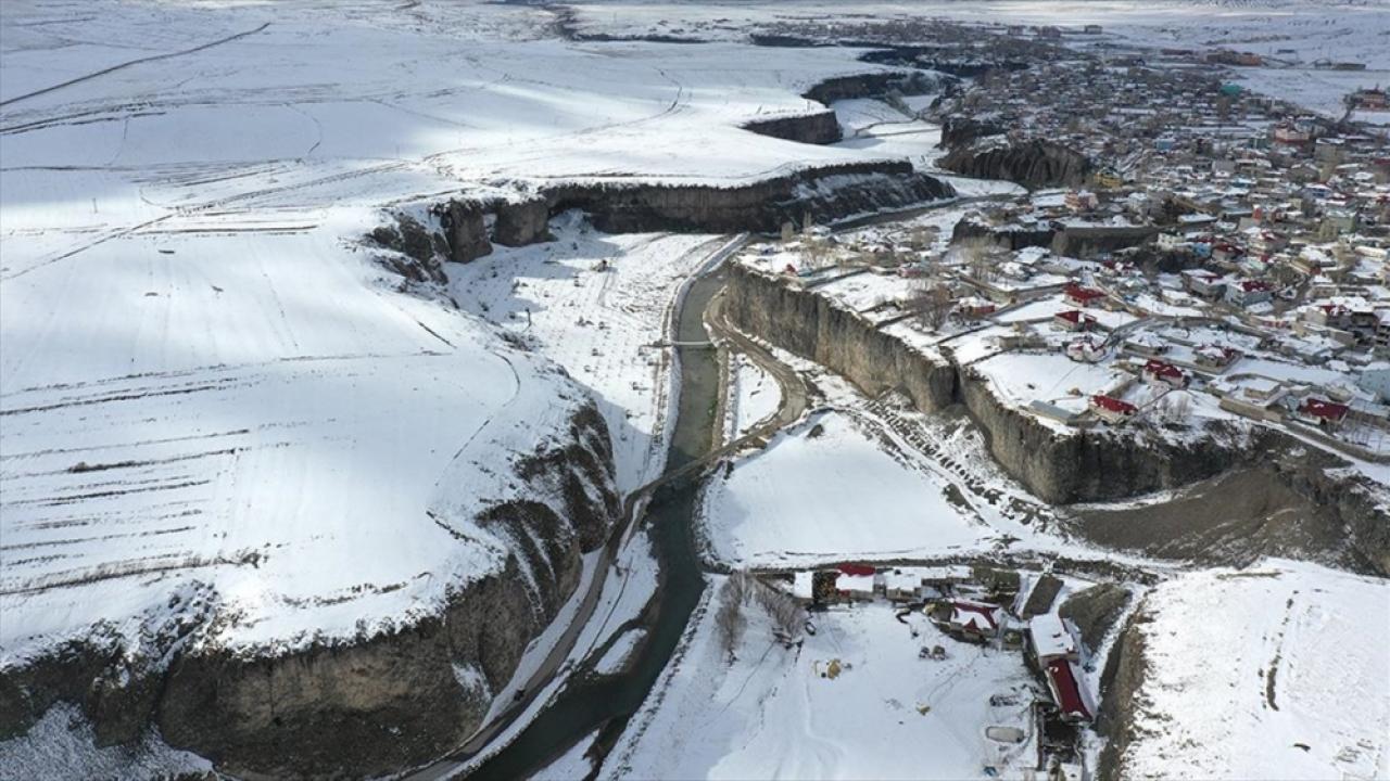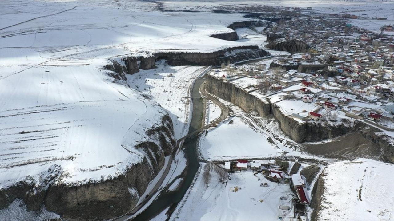 Kar yağışı sonrası beyaza bürünen kanyon ve çevresi, Anadolu Ajansı ekibince drone ile görüntülendi.