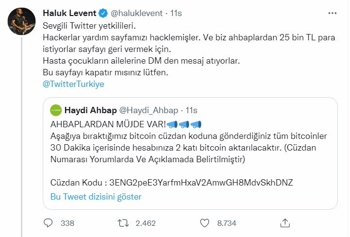 AHBAP Derneği’yle Türkiye’nin dört bir yanında ihtiyacı olanlara destek veren sanatçı Haluk Levent’i şoke eden olay! AHBAP’ın resmi Twitter hesabının çalındığını duyuran Levent, şu açıklamayı yaptı: