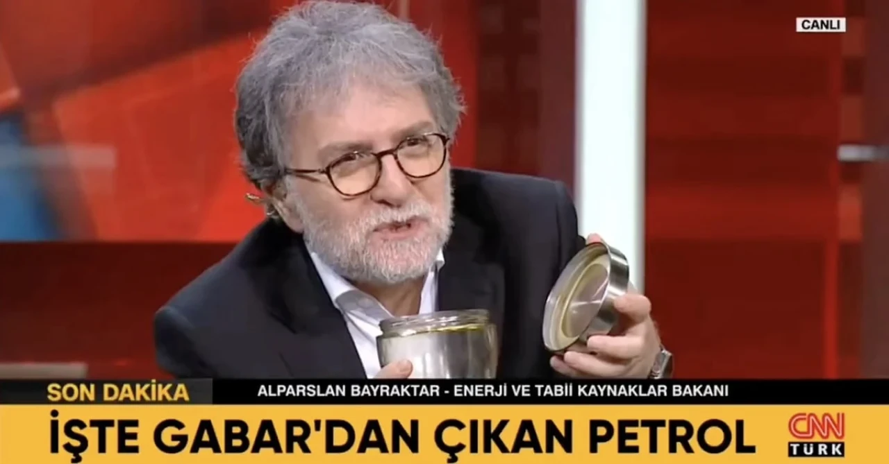 Enerji sektöründe büyük bir heyecana neden olan Gabar Dağı'nda petrol keşfi, kamuoyunda gündemin en önemli maddelerinden biri olmaya devam ediyor. Bu tarihi keşif, gazeteci ve televizyon sunucusu Ahmet Hakan’ın canlı yayınına da taşındı. CNN Türk ekranlarında yayınlanan programa konuk olan Enerji ve Tabii Kaynaklar Bakanı Alparslan Bayraktar, beraberinde Gabar Dağı'ndan çıkarılan ham petrolü de getirdi. Canlı yayında Ahmet Hakan’ın petrolü koklama anı sosyal medyada gündem oldu.