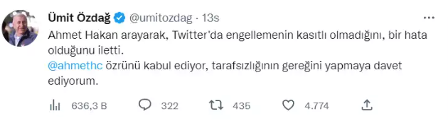 Ümit Özdağ, "Ahmet Hakan arayarak, Twitter'da engellemenin kasıtlı olmadığını, bir hata olduğunu iletti. Ahmet Hakan'ın özrünü kabul ediyor, tarafsızlığının gereğini yapmaya davet ediyorum." dedi.