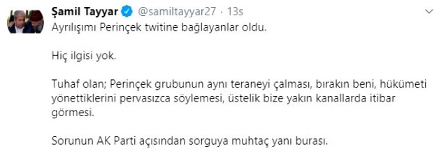 "Ayrılışımı Perinçek twitine bağlayanlar oldu. Hiç ilgisi yok. Tuhaf olan; Perinçek grubunun aynı teraneyi çalması, bırakın beni, hükümeti yönettiklerini pervasızca söylemesi, üstelik bize yakın kanallarda itibar görmesi. Sorunun AK Parti açısından sorguya muhtaç yanı burası" ifadelerini kullandı.