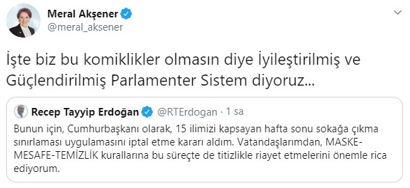 Cumhurbaşkanı Erdoğan'ın 'Bunun için, Cumhurbaşkanı olarak, 15 ilimizi kapsayan hafta sonu sokağa çıkma sınırlaması uygulamasını iptal etme kararı aldım. Vatandaşlarımdan, MASKE-MESAFE-TEMİZLİK kurallarına bu süreçte de titizlikle riayet etmelerini önemle rica ediyorum' sözlerini alıntılayan Akşener, 'İşte biz bu komiklikler olmasın diye İyileştirilmiş ve Güçlendirilmiş Parlamenter Sistem diyoruz...' ifadeleri kaydetti.