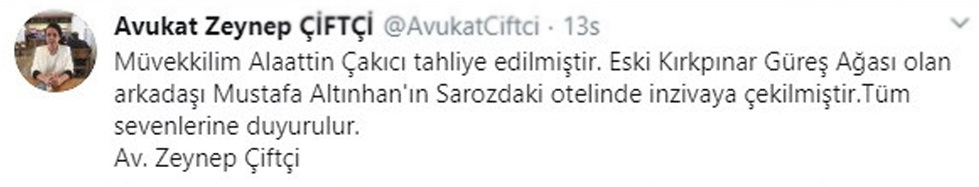 Av. Zeynep Çiftçi sosyal medya hesabından şu paylaşımı yaptı: “Müvekkilim Alaattin Çakıcı tahliye edilmiştir. Eski Kırkpınar Güreş Ağası olan arkadaşı Mustafa Altınhan’ın Sarozdaki otelinde inzivaya çekilmiştir.Tüm sevenlerine duyurulur”