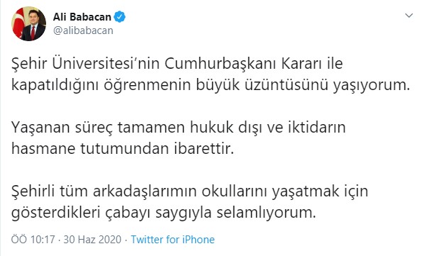 "Şehir Üniversitesi’nin Cumhurbaşkanı Kararı ile kapatıldığını öğrenmenin büyük üzüntüsünü yaşıyorum. Yaşanan süreç tamamen hukuk dışı ve iktidarın hasmane tutumundan ibarettir. Şehirli tüm arkadaşlarımın okullarını yaşatmak için gösterdikleri çabayı saygıyla selamlıyorum."