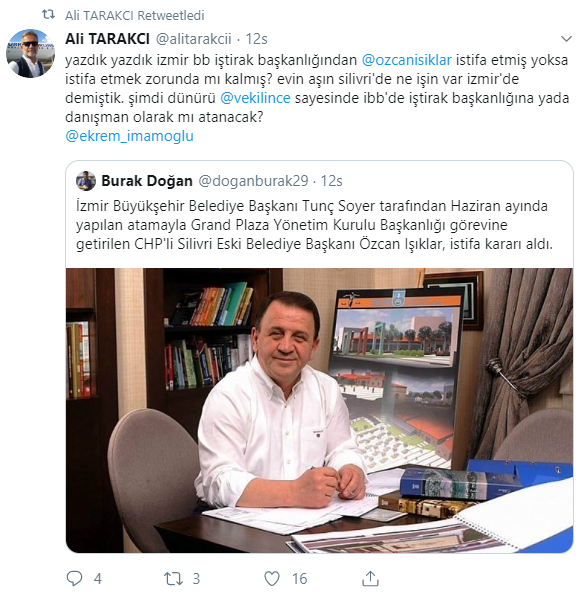 Twitter'dan önemli açıklamalarda bulunan Tarakçı; "İzmir Büyükşehir Belediyesi iştirak başkanlığından Özcan Işıklar istifa etmiş yoksa istifa etmek zorunda mı kalmış? Evin, aşın Silivri'de ne işin var İzmir'de demiştik. Şimdi dünürü Muharrem İnce sayesinde İBB'de iştirak başkanlığına ya da danışman olarak mı atanacak? " diye sordu.