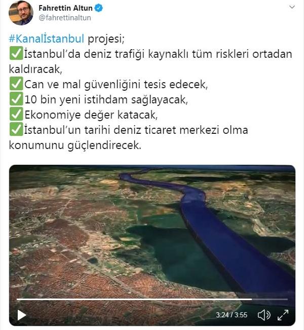 Altun, Twitter hesabından yaptığı açıklamada, "Kanal İstanbul projesi; İstanbul’da deniz trafiği kaynaklı tüm riskleri ortadan kaldıracak, can ve mal güvenliğini tesis edecek,10 bin yeni istihdam sağlayacak, ekonomiye değer katacak, İstanbul'un tarihi deniz ticaret merkezi olma konumunu güçlendirecek" ifadelerini kullandı. Altun ayrıca, projeye ilişkin hazırlanan videoyu paylaştı.