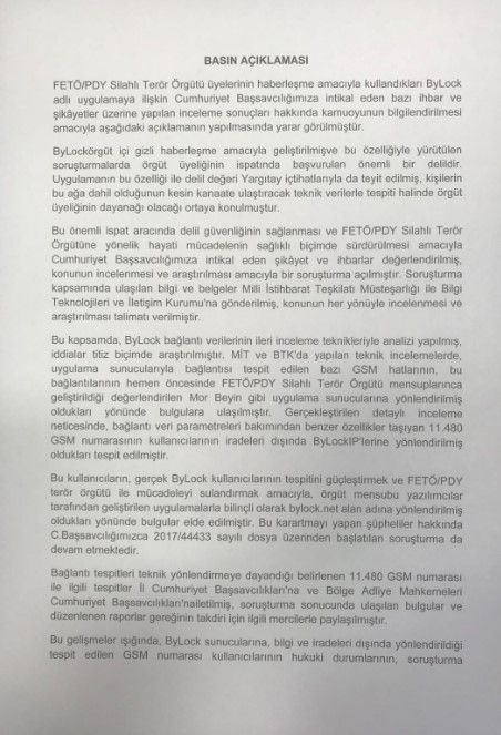 “Gerçek ByLock kullanıcılarının tespitini güçleştirmek ve FETÖ ile mücadeleyi mücadeleyi sulandırmak amacıyla örgüt mensubu yazılımcılar tarafından geliştirilen uygulamalarla bilinçli olarak Bylock.net alan adına yönlendirilmiş oldukları yönünde bulgular elde edilmiştir. Bu karartmayı yapan şüpheliler hakkında soruşturma devam etmektedir”