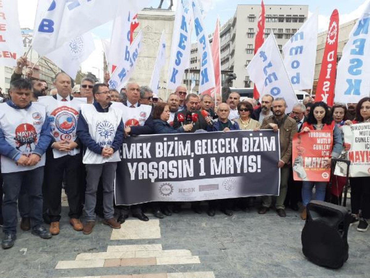 DHA- DİSK İç Anadolu Bölge Temsilciliği, Kamu Emekçileri Sendikaları Konfederasyonu (KESK) Ankara Şubesi, Türk Mühendis ve Mimar Odaları Birliği (TMMOB) Ankara Şubesi, Ankara Serbest Muhasebeci ve Mali Müşavirler Odası (ASMMMO) ile Ankara Tabip Odası (ATO) üyesi yaklaşık 100 kişi, '1 Mayıs Emek ve Dayanışma Günü' etkinlikleri ile ilgili Ulus Atatürk Anıtı önünde basın açıklaması yaptı.
