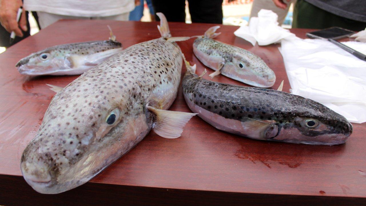 Antalya'da istilacı deniz türleriyle mücadele kapsamında gerçekleştirilen balon balığı avlama yarışmasında balıkçılar, 90 santimetre uzunluğunda, 4 kilo 40 gramlık balon balığı yakaladı.