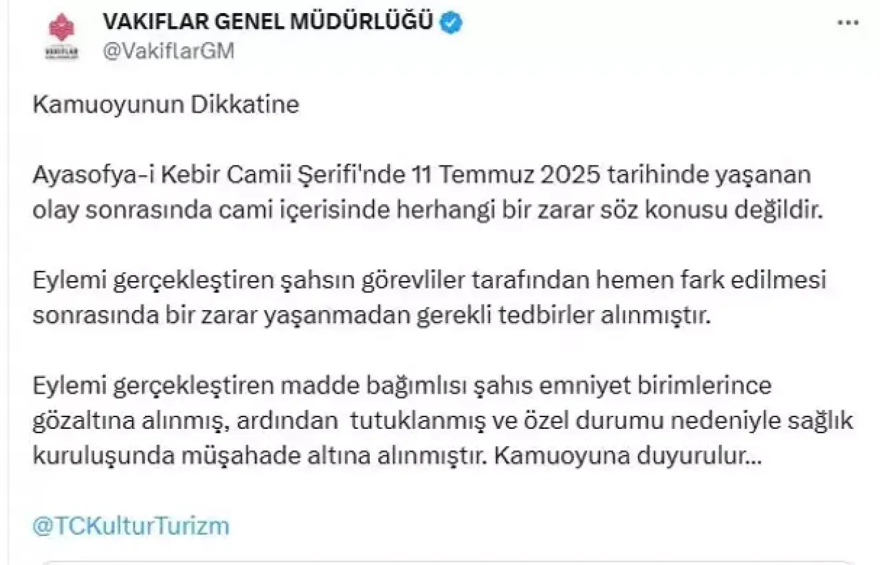 Tarihi ve manevi önemiyle İstanbul’un kalbinde yer alan Ayasofya-i Kebir Camii Şerifi’nde 11 Temmuz 2025 günü yaşanan olaya ilişkin resmi açıklama geldi. Vakıflar Genel Müdürlüğü tarafından yapılan açıklamada, olayın etkileri ve alınan tedbirler kamuoyuyla paylaşıldı.