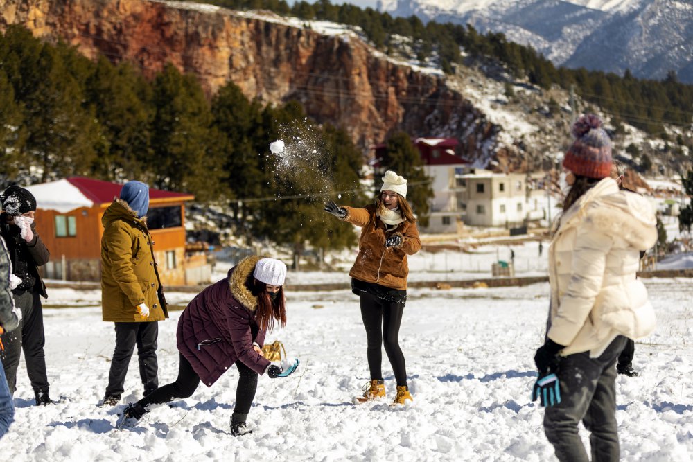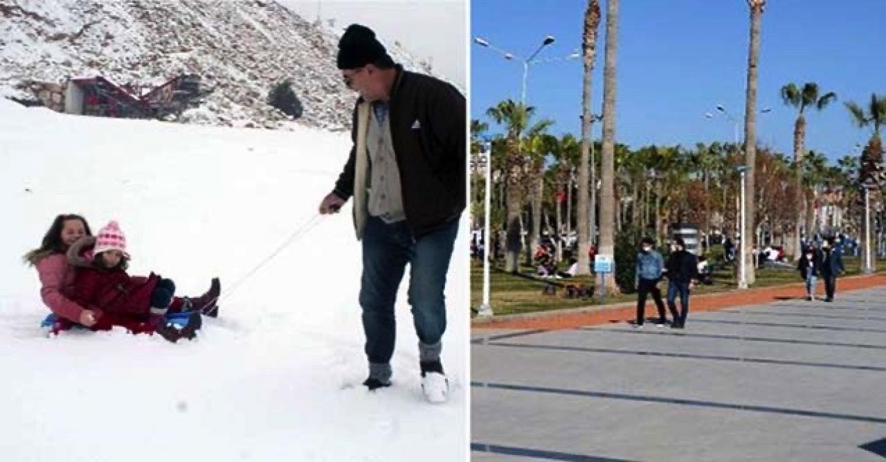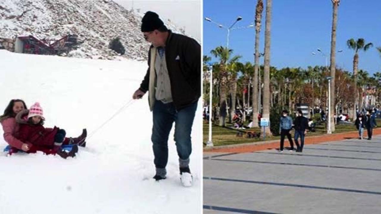Aynı anda aynı şehirde iki mevsim birden yaşanıyor. Mersin'de vatandaşların bir kısmı Toroslar'a çıkarak kayak yapıp kar topu oynayarak kışın tadını çıkarırken, bir kısmı da kent merkezinde sahile inerek balık tutuyor, yürüyüş yapıyor, çimlere oturuyor ve güneşli havanın keyfini çıkarıyor.