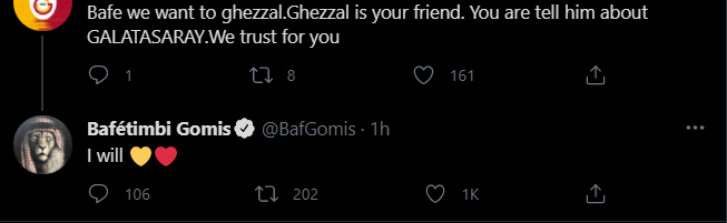 Bir Galatasaray taraftarının, "Biz Ghezzal'ı istiyoruz. Senin arkadaşın. Onunla konuş ve kendisine Galatasaray'ı anlat. Sana güveniyoruz." sözleri üzerine sarı kırmızılıların eski golcüsü Bafetimbi Gomis, "Yapacağım." yanıtını verdi.