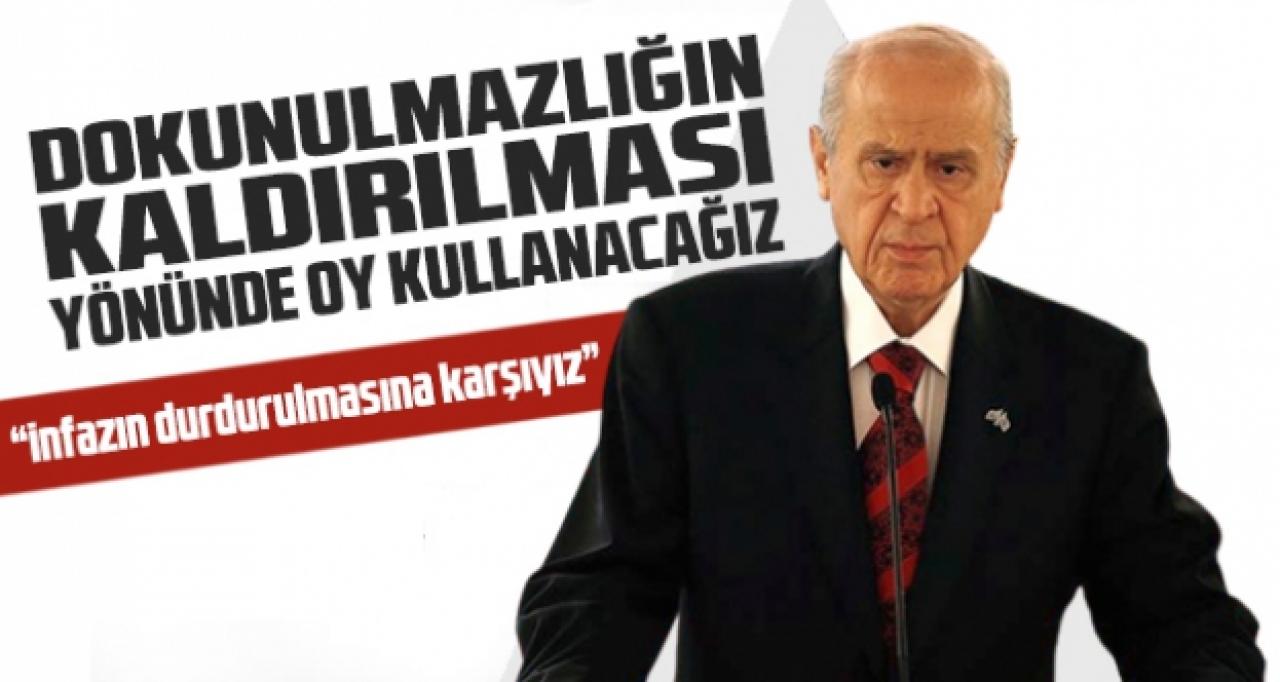 MHP Genel Başkanı Devlet Bahçeli, eski CHP milletvekili Enis Berberoğlu'nun dokunulmazlığının kaldırılmasına yönelik fezleke Meclis'e geldiğinde dokunulmazlığın kaldırılması yönünde oy kullanacaklarını belirtti.