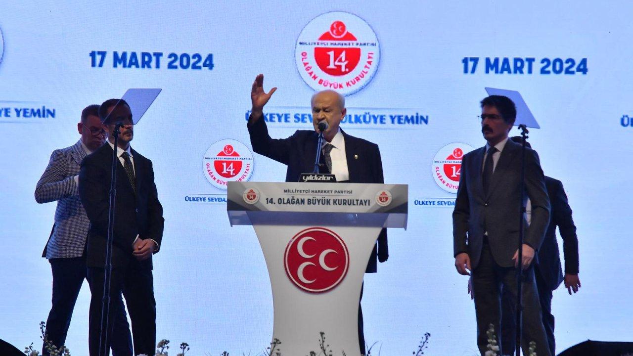 Omuz burkulması sonucu kolu incinen MHP Genel Başkanı Devlet Bahçeli ise kongreye kol askısı ile katıldı. Burada konuşan Bahçeli, Türkiye'de bir muhalefet bozgunu yaşandığını belirterek, "CHP 3'üncü dünya ülkelerindeki muhalefet partilerinden çok daha aşağıdadır. Terör örgütü PKK'nın siyasallaşmasını misyon edinen CHP, DEM'lenerek metruk bir tekneyi aratmayacak şekilde rotasını kaybetmiş, bu suretle bölücü korsanlar tarafından rehin alınmıştır. Kuşkusuz böylesi ayıp ve rezalet kendi bilecekleri bir şeydir. Bizi ilgilendiren DEM'lenmiş CHP ve siyasi uyduları kanalıyla ülkemize ve milletimize reva görünen haksızlıklar, söylenen kuyruklu yalanlar, günden güne cesareti artan güvenlik tehlikeleridir. Bu tabloya karşısında CHP'ye oy veren vatandaşlarımızın ızdıraplarına kederlenmemek elimizde değildir. DEM, CHP'yi maalesef dönüştürmekle kalmamış tarih ve istikametinden koparmıştır. CHP tanınmaz halde olmakla birlikte mayına basmış melez bir siyasetle donanmış, siyasi seçenek olmaktan bütünüyle uzaklaşmıştır. Bu partide ayaklar baş, başlar ayaktır. Kimin fiilen genel başkan olduğu belli değildir. Her gün yeşeren çıkar kavgaları insanımızı rahatsız eden gürültü kirliliğin patlak veren krizler CHP'nin güvenilmez siyasetini açığa vurmuş, teşhir etmiştir. İstanbul Çekmeköy'de seccade, Ataşehir'de zikirmatik dağıtan insanımızın ekonomik durumunu sömürürken ofislerde utanmadan, sıkılmadan balya balya para sayan CHP yönetimi ne yapsa beyhudedir. Zira DEM'lenip PKK ile "Kent İttifakı" maskesi altında organik bağ kurmasının bedelini 14 gün sonra sandıkta ödeyecektir" dedi.