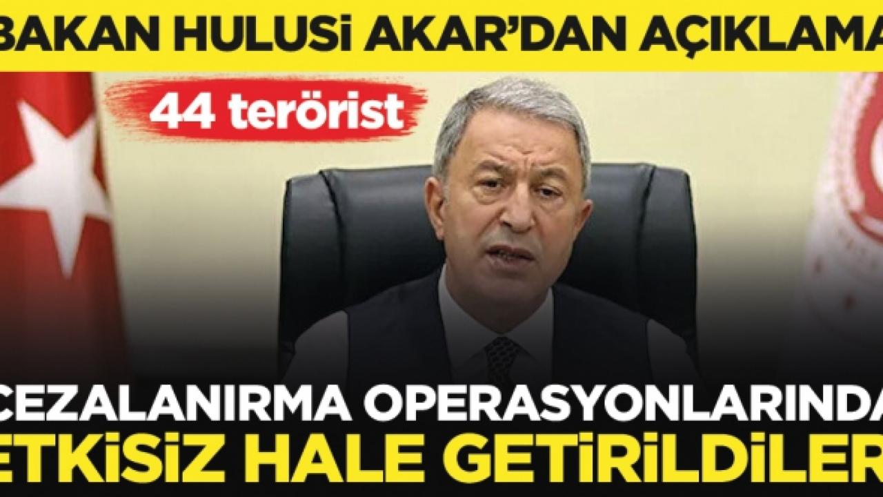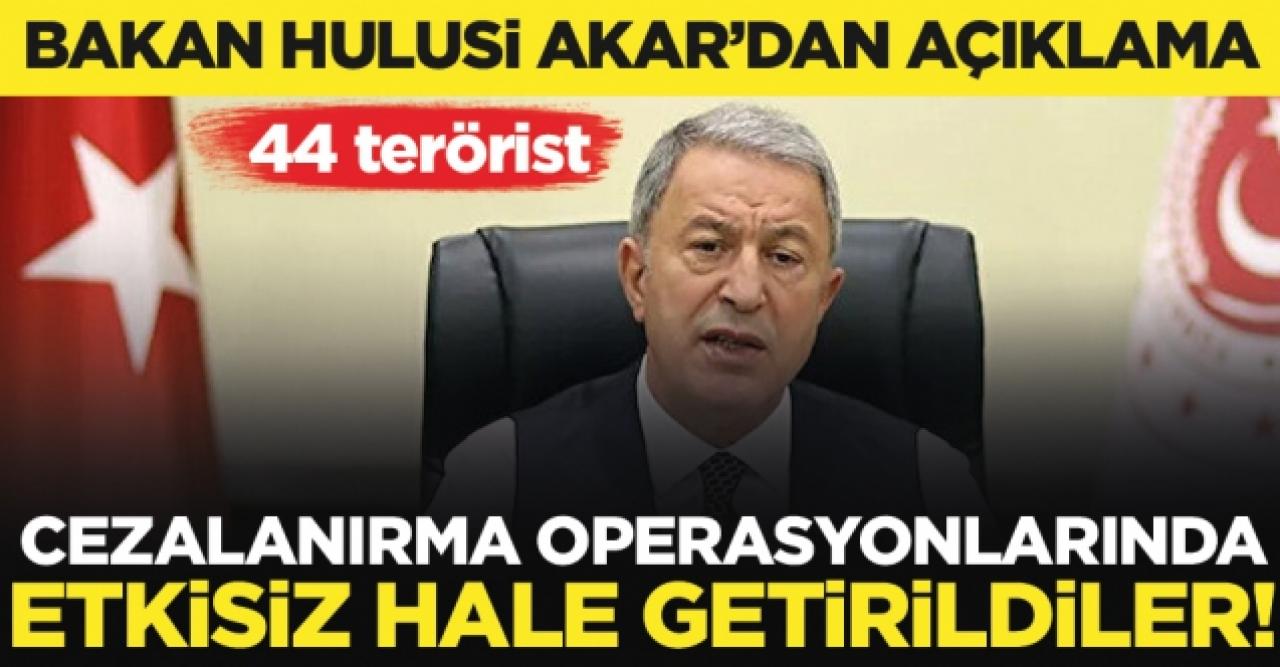 Akar, teröristlerin EYP'li saldırısında 3 kahraman Mehmetçiğin şehit olduğunu hatırlatarak, "Hain saldırının ardından belirlenen hedeflere yönelik cezalandırma operasyonları başlattık. Cezalandırma operasyonları sonucunda kahraman Mehmetçik tarafından, son durum itibarıyla, 44 terörist etkisiz hale getirildi. Şehitlerimizin kanlarını yerde bırakmadık, bırakmayacağız. Suriye’deki muhataplarımızın mutabakatlar kapsamındaki sorumluluklarını yerine getirmesini bekliyoruz. Sınırlarımızın ötesinden gelen, planlandığını değerlendirdiğimiz saldırıların tahammül sınırlarımızı zorladığını hatta tahammül sınırlarımızı aştığını söyleyebiliriz. Yapılan her saldırının misliyle karşılık bulacağından ve hesabının sorulacağından kimsenin şüphesi olmasın" diye konuştu.
