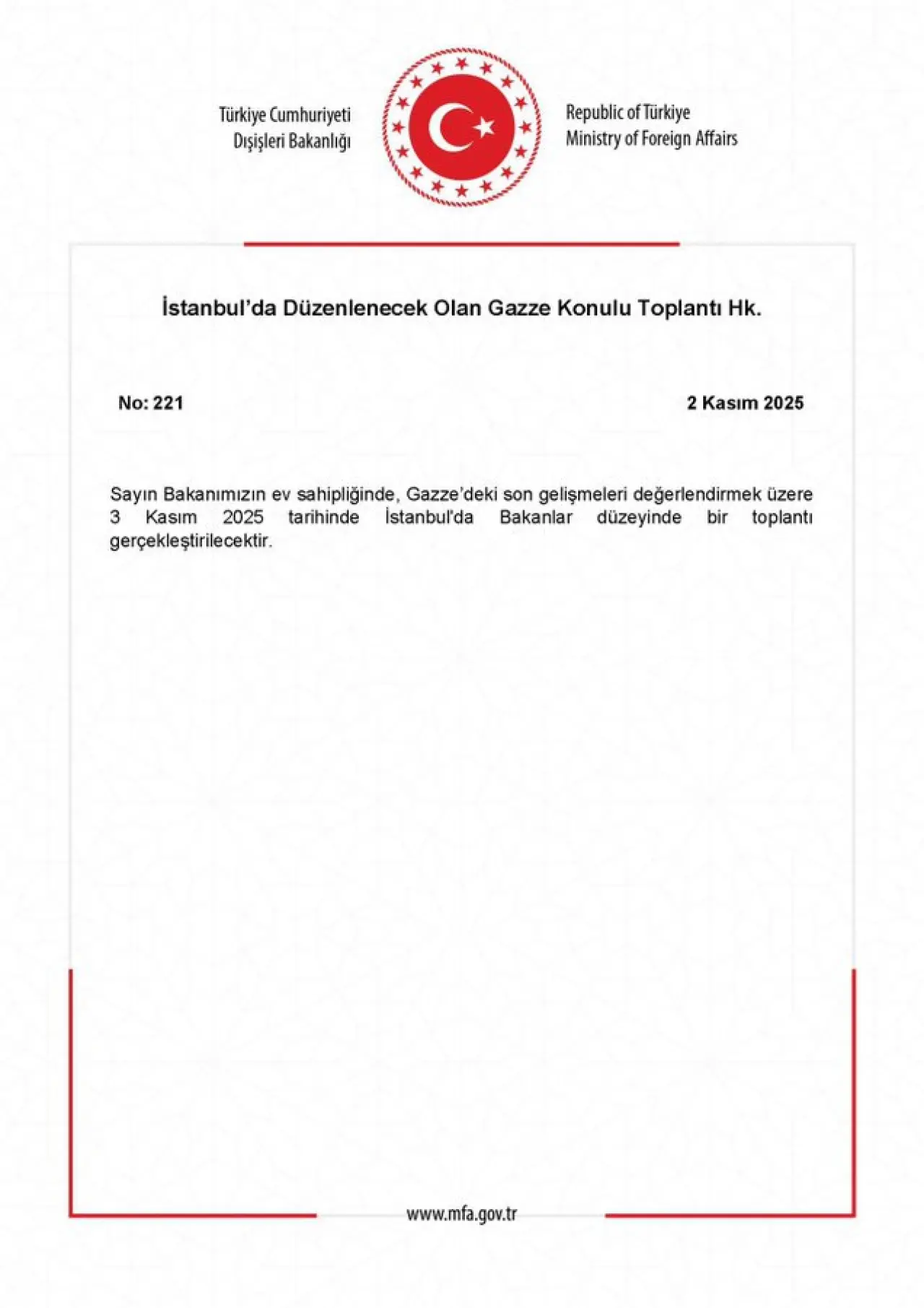 Toplantıya, Dışişleri Bakanı Hakan Fidan ev sahipliği yapacak. Görüşmelere Birleşik Arap Emirlikleri, Endonezya, Katar, Pakistan, Suudi Arabistan ve Ürdün’ün dışişleri bakanları katılıyor. Toplantının odak noktasında, Gazze’deki ateşkes sonrası insani durum ve bölgesel gelişmeler bulunuyor.