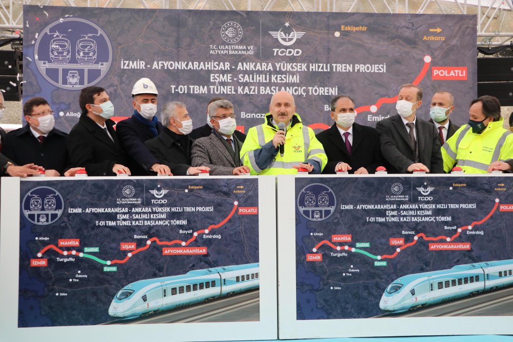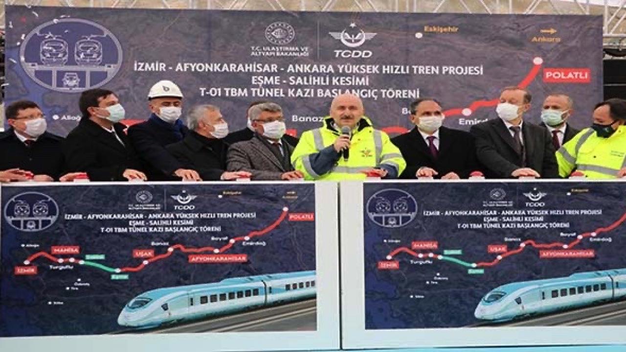 Bakan Karaismailoğlu şöyle devam etti: "Tamamlandığında Ankara-İzmir arasındaki seyahat süresini 3 saat 30 dakikaya düşürecek olan Ankara-İzmir Hızlı Tren Hattı'nın uzunluğu 624 kilometre. Proje kapsamında 41 kilometre uzunluğunda 49 tünel açılacak. 23.1 kilometre uzunluğunda 56 viyadük inşa edilecektir. Toplam 115.8 milyon metreküp kazı, 47.9 milyon metreküp dolgu yapılacaktır. Şu ana kadar altyapı işlerini yüzde 42.43 oranında tamamladık. 12 bin 800 metre uzunluğunda 14 adet tünel açtık. 10 bin 150 metre uzunluğunda 18 adet viyadük inşa ettik. 66 milyon metreküp kazı yaptık ve 47.9 milyon metreküp dolgu gerçekleştirdik. Bugün de sizlerin huzurunda, Ankara-İzmir Hızlı Tren Hattımızın Eşme-Salihli kesiminin en uzun tüneli olan 3 bin 47 metre uzunluğundaki T1 Tüneli'nin kazısına başlayacağız."