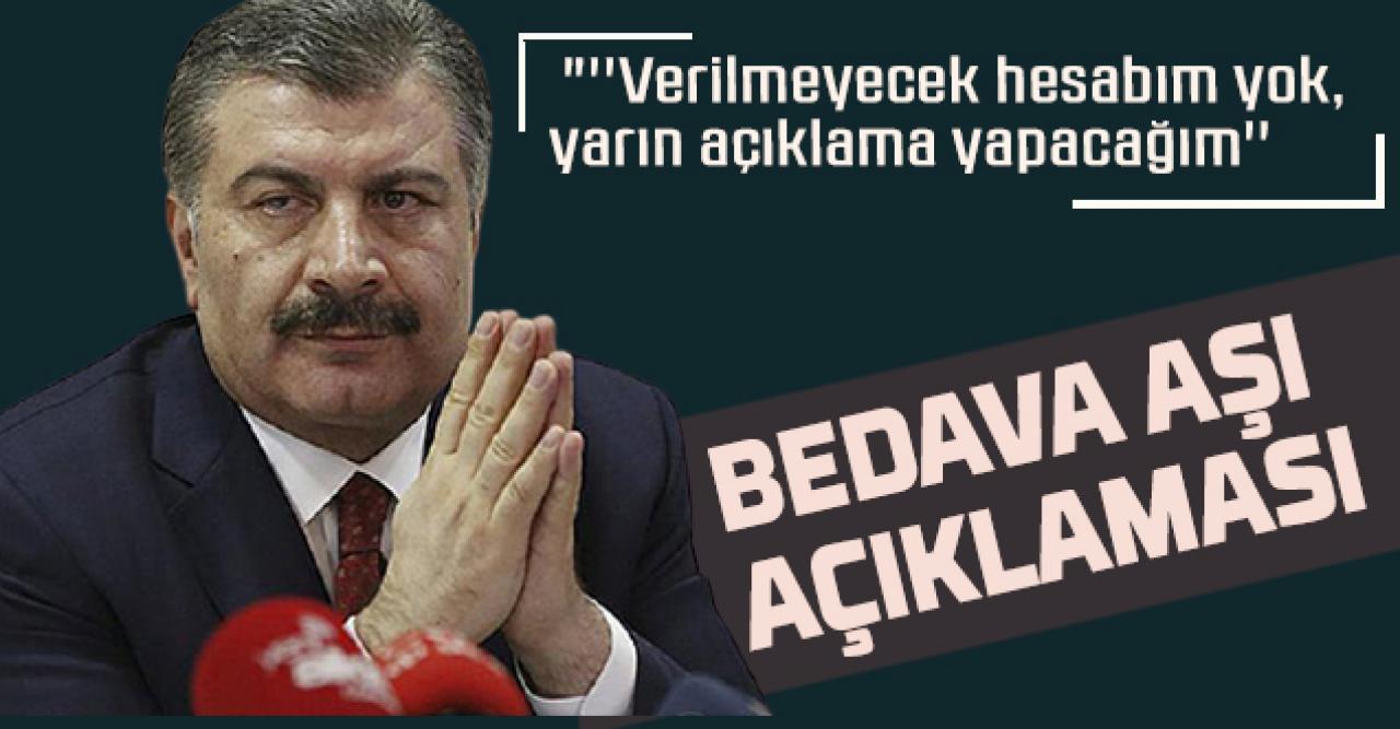Sağlık Bakanı Fahrettin Koca, CHP Genel Başkanı Kemal Kılıçdaroğlu’nun gündeme taşıdığı ‘bedava aşı’ iddialarına ilişkin "Verilmeyecek hesabım yok. Yarın yapacağım toplantıyla detaylı bir açıklama yapacağım" dedi.