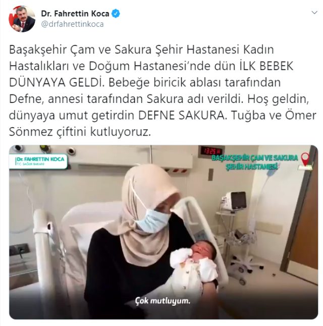 Bakan Koca, Twitter hesabından yaptığı paylaşımda, Başakşehir Çam ve Sakura Şehir Hastanesi Kadın Hastalıkları ve Doğum Hastanesinde ilk bebeğin dünyaya geldiğine ilişkin bir video paylaştı.