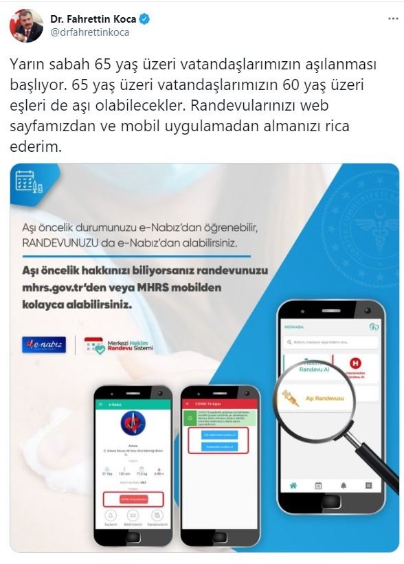 Yarın sabah 65 yaş üzeri vatandaşlarımızın aşılanması başlıyor. 65 yaş üzeri vatandaşlarımızın 60 yaş üzeri eşleri de aşı olabilecekler. Randevularınızı web sayfamızdan ve mobil uygulamadan almanızı rica ederim.