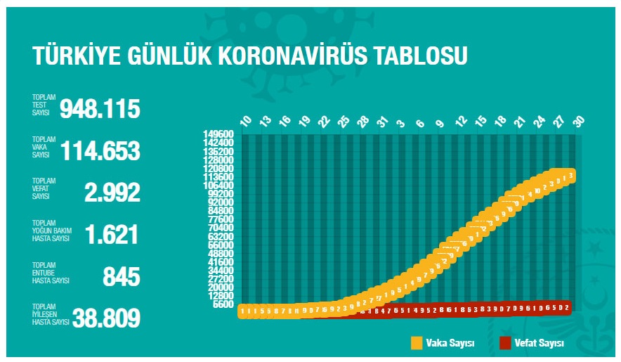 Bugün toplam 29 bin 230 test yapılırken 2 bin 392 yeni vaka tanısı koyuldu. Toplam vaka sayısı ise 114 bin 653 oldu. Bugünkü 5 bin 18 kişi ile birlikte toplam iyileşen sayısı 38 bin 809'a yükseldi. Toplam entübe hasta sayısının 845 toplam yoğun bakım hasta sayısının ise bin 621 olduğunu açıkladı.