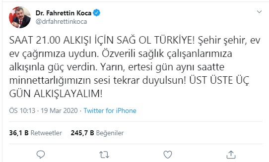 "Saat 21.00 alkışı için sağ ol Türkiye. Şehir şehir, ev ev çağrımıza uydun, özverili sağlık çalışanlarımıza alkışınla güç verdin. Yarın, ertesi gün aynı saatte minnettarlığımızın sesi tekrar duyulsun. Üst üste üç gün alkışlayalım" dedi.
